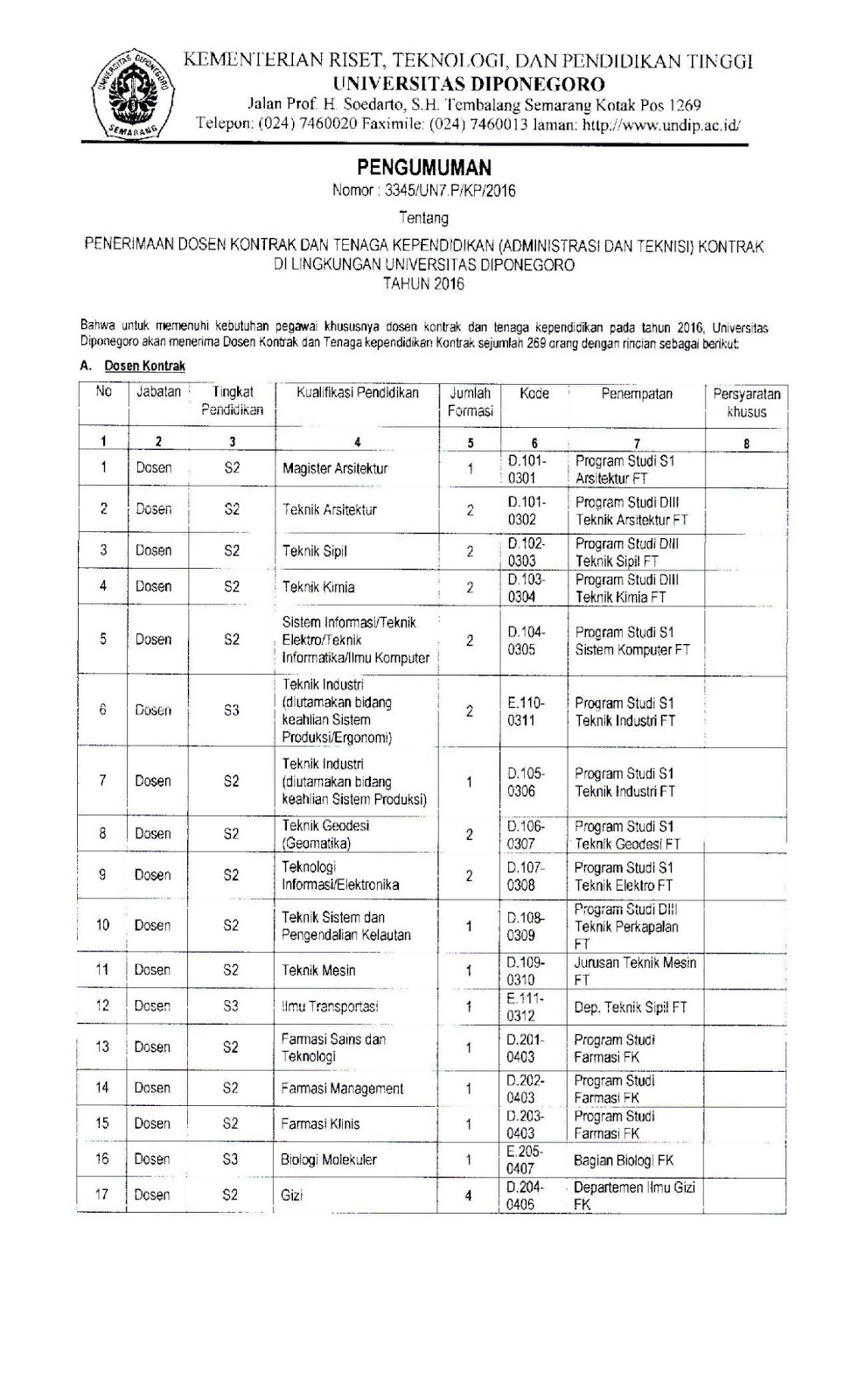 Bahwa untuk memenuhi kebutuhan pegawai khususnya dosen kontrak dan tenaga kependidikan pada tahun 2016, Universitas Diponegoro akan menerima Dosen Kontrak dan Tenaga kependidikan Kontrak sejumlah 269 orang dengan rincian sebagai berikut: