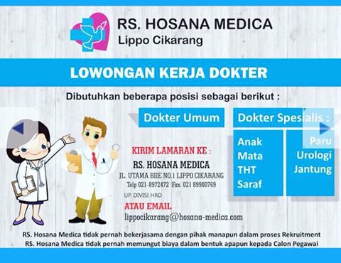 Untuk informasi lebih lanjut, dan keterangan pengiriman lamaran dapat di lihat di website Rumah Sakit: http://www.hosana-medica.com