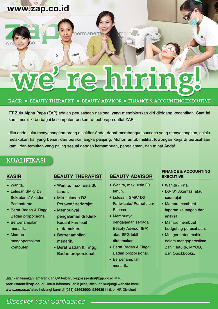 PT ZAP adalah perusahaan nasional yang fokus pada bidang klinik kecantikan. Saat ini kami memiliki berbagai kesempatan berkarir di kantor pusat kami yang berlokasi di Permata Hijau (Jaksel), maupun di outlet-outlet kami di Jakarta, Bandung, Semarang, Yogyakarta, Surabaya, dan segera menyusul Bali, Makasar, dan Medan.